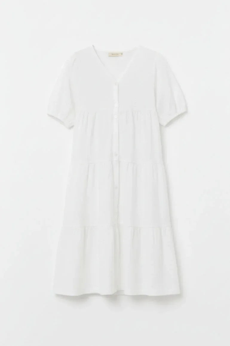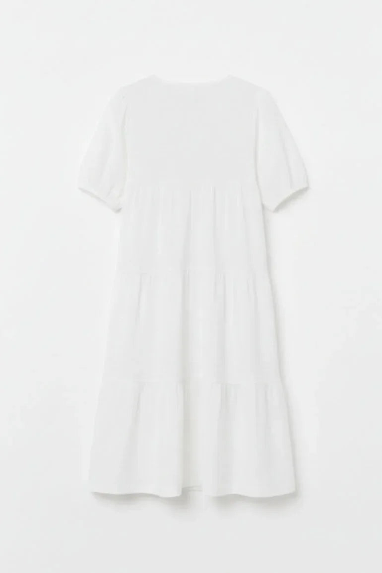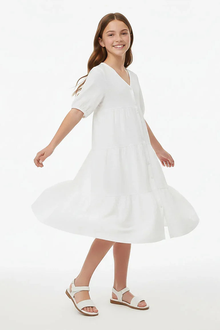 Elegant white tiered dress for girls designed with soft puff sleeves and a flowy silhouette. Crafted from lightweight, breathable fabric for all-day comfort. Perfect for casual wear, summer outings, and special occasions.