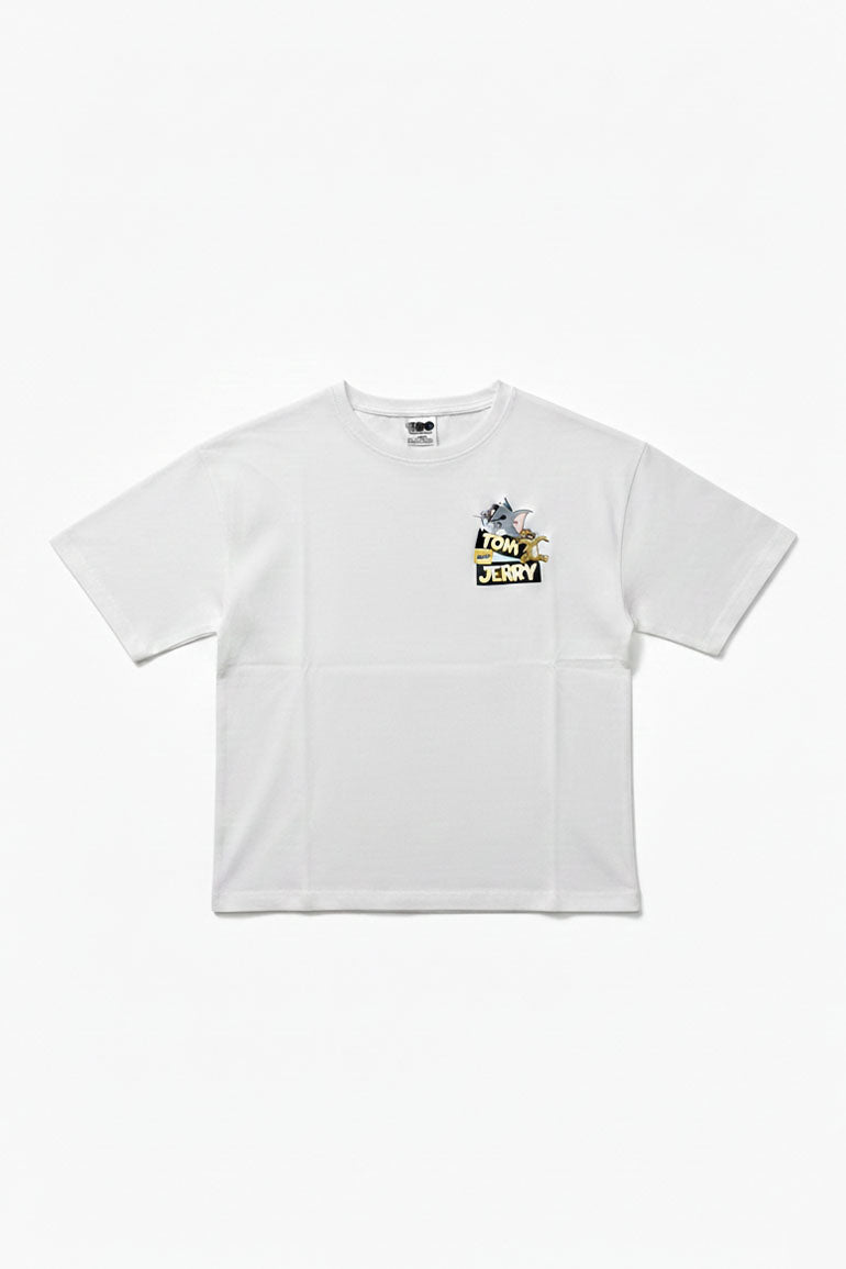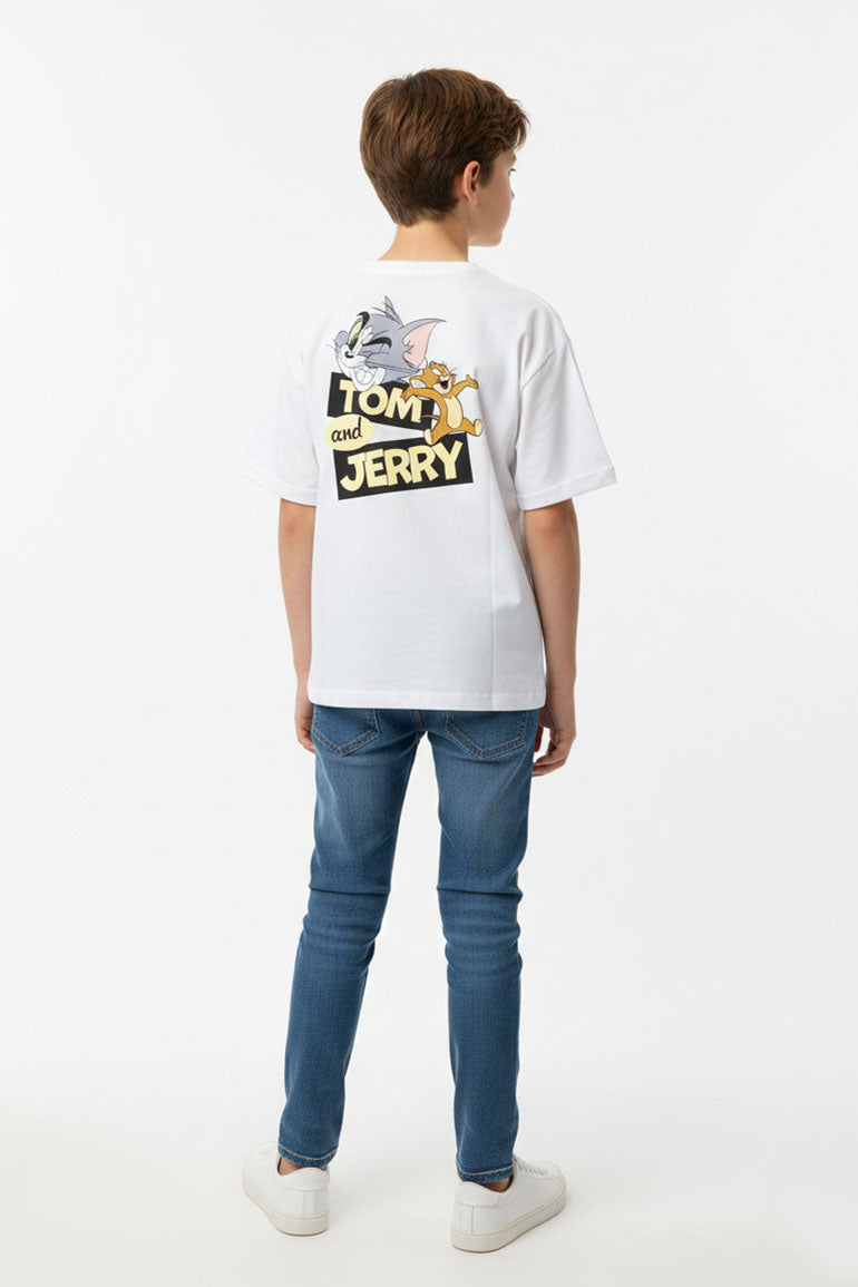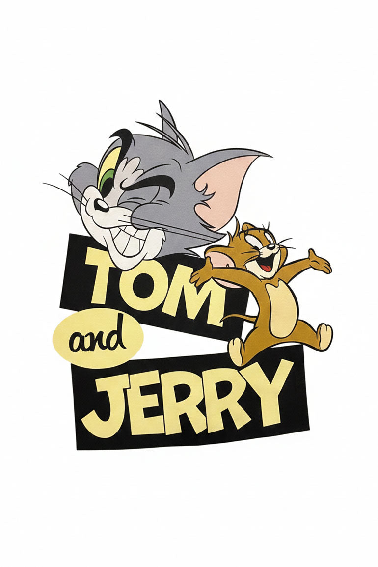 Clean white t-shirt featuring a playful Tom & Jerry chest graphic for a fun, cartoon-inspired touch. Crafted from soft, breathable fabric for all-day comfort, perfect for casual wear with a cool and cheerful look.